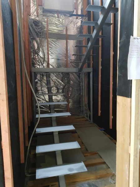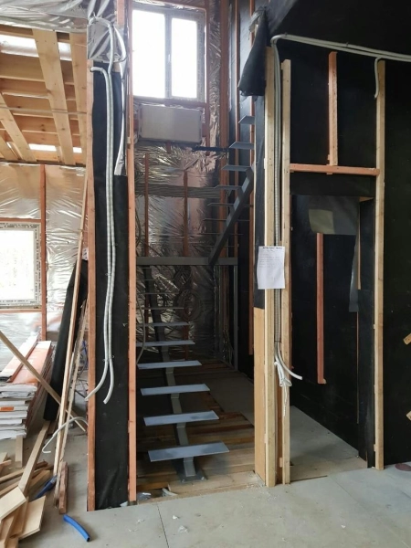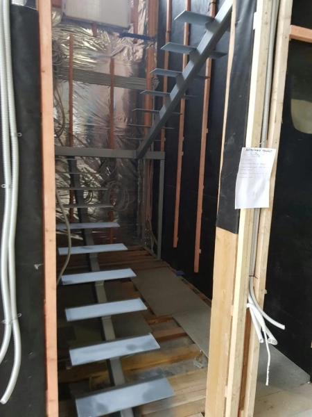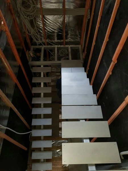 Каркас открытой лестницы с 1-го на 2-ой этаж дома на монокосоуре из 2 маршей с площадкой.