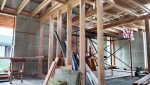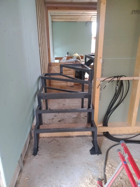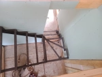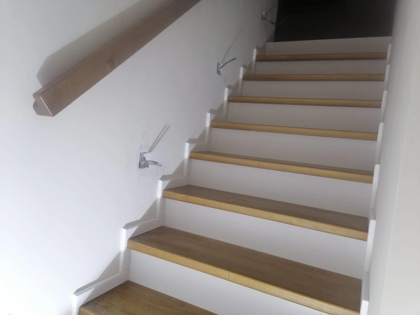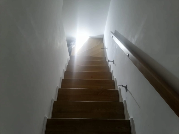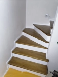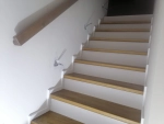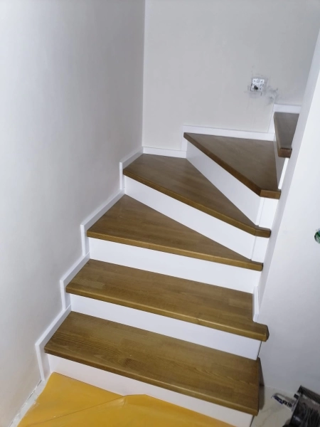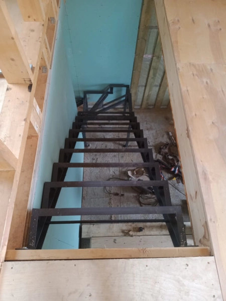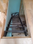 Лестница закрытого типа на металлокаркасе, с забежными ступенями установлена в частный дом. Каркас выполнен из швеллера 10П и уголка 45. Покрыт грунтовкой серого цвета. Обшивка: ступени из лиственницы паркетной 40 мм, покрытые лаком в два слоя, подступенник, плинтус. Дополнительно в стену установлен деревянный поручень из лиственницы.