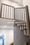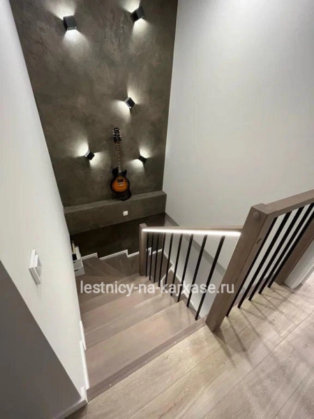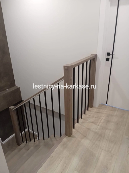 Ограждения металлические из круглой трубы черного цвета и деревянный поручнем, окрашенным в цвет ступеней.