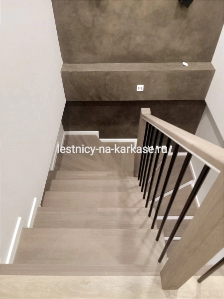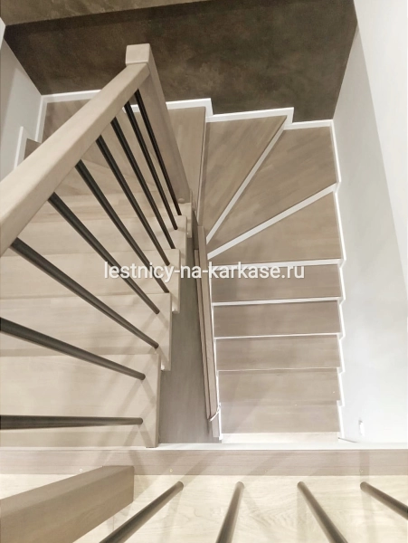 Для частного дома — лестница закрытого типа из листа металла П-образной формы с забежными ступенями и опорными стойками. Каркас выполнен из листа ГК 6 мм, уголка 45 и пластины 40х4. Опорные стойки выполнены из проф.трубы 50х50. Высота каркаса 3003, высота ступени 177 мм, глубина — 250 мм. Покрыт грунтовкой серого цвета.