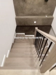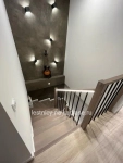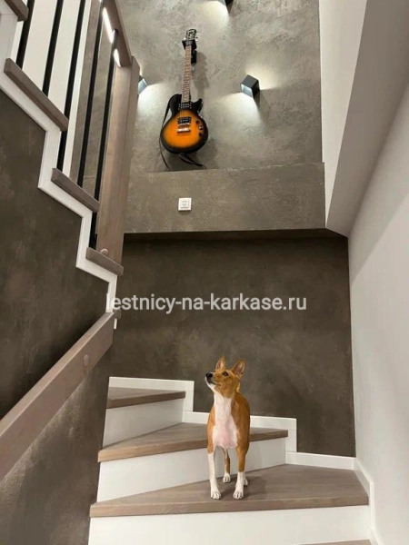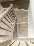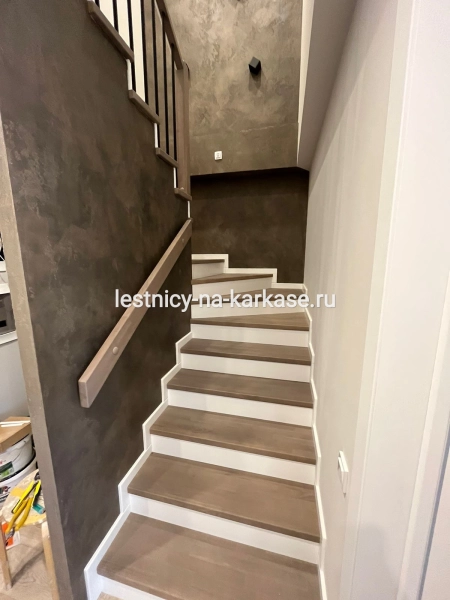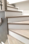 Ступени из ясеня паркетного 40 мм. Подступенок из МДФ + плинтус. Выкрас ступеней в цвет по палитре.