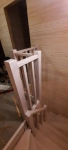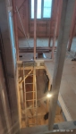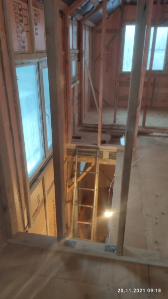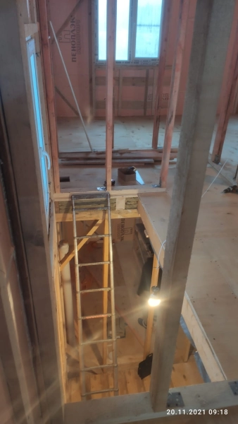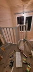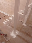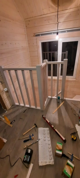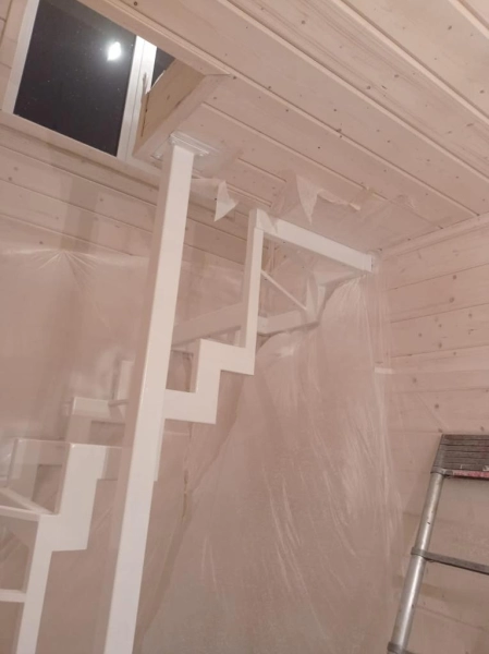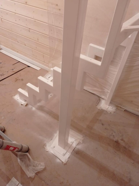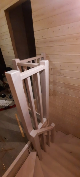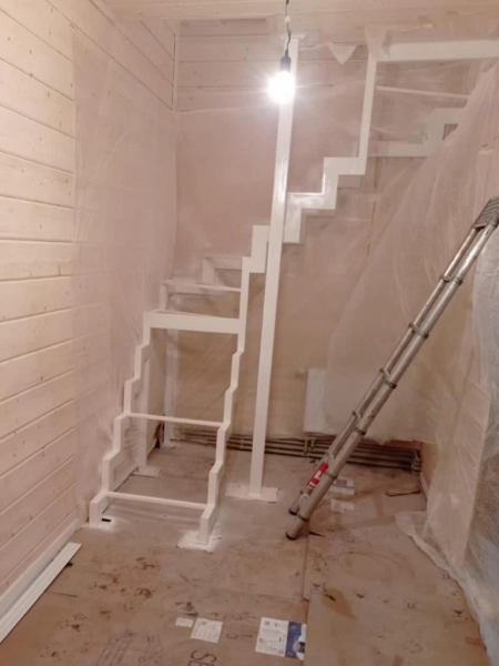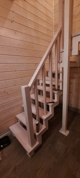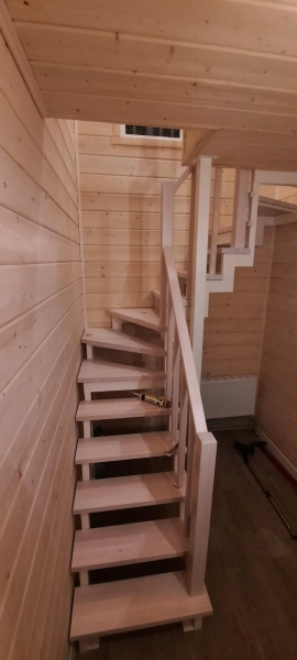 Лестница открытого типа, с забежными ступенями установлена в частный дом. Каркас выполнен из проф. трубы 100х50. Покрыт белой гладкой полуматовой краской Hammerite. Ступени из лиственницы паркетной 40 мм, покрытые лаком в два слоя. Установлены деревянные ограждения из лиственницы.