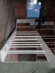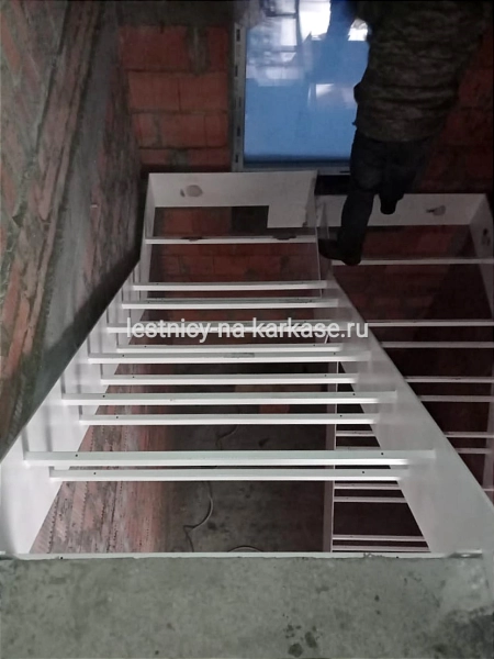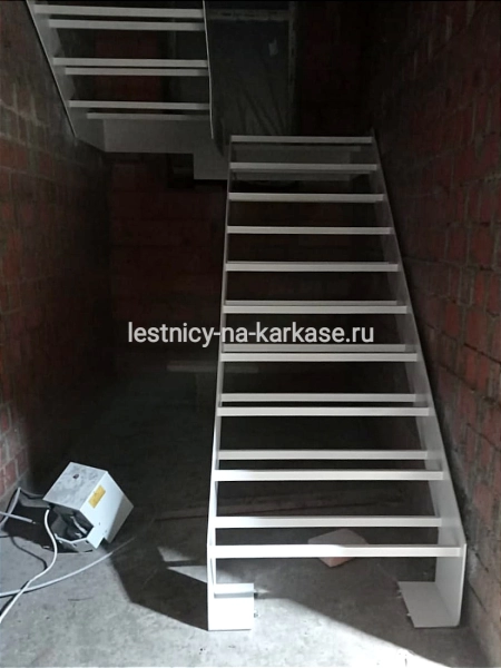 Для частного дома — каркас лестничный открытого типа на тетиве П-образной формы с поворотными площадками. Каркас выполнен из проф.трубы 40х20 мм и листа ГК 8 мм. Высота каркаса 3670, высота ступени 200 мм, глубина — 250 мм. Покрыт белой глянцевой краской Hammerite.