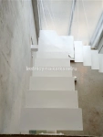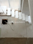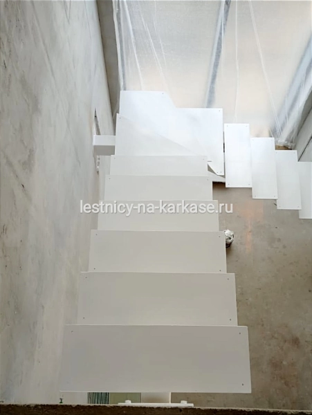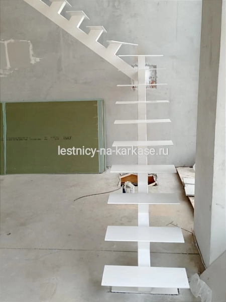 Для частного дома — каркас лестничный открытого типа на монокосоуре Г-образной формы с забежными ступенями. Каркас выполнен из проф.трубы 140х100х4, листа ГК 8 мм. Высота каркаса 3395, высота ступени 189 мм, глубина — 260 мм. Покрыт белой глянцевой краской Hammerite.