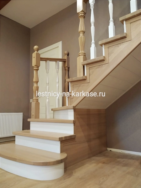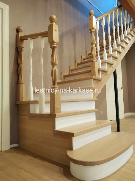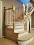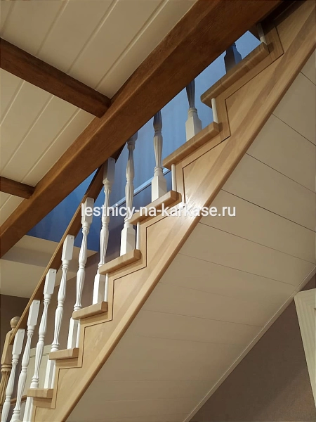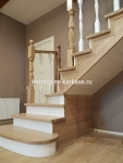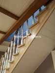Ступени из ясеня цельноламельного 40 мм, покрыты лаком в два слоя. Выкрас ступеней в цвет по палитре. Ограждения из лиственницы резные, покрыты лаком в два слоя.