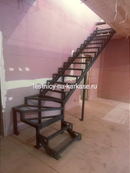 Для частного дома — лестница закрытого типа из швеллера Г-образной формы с забежными ступенями. Верхний марш и пригласительные ступени выполнены из швеллера 10П, уголка 45. Забежные ступени из проф.трубы 100х50, профиля 63. Высота каркаса 3020, высота ступени 170 мм, глубина — 270 мм. Покрыт грунтовкой черного цвета.