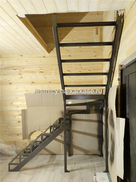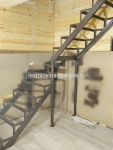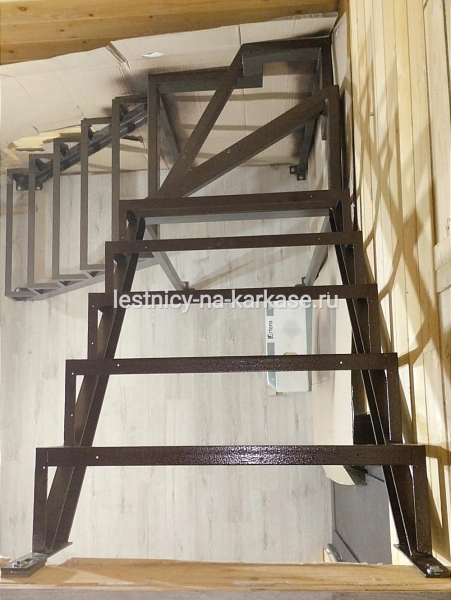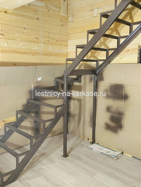 Для частного дома — каркас лестничный открытого типа Лофт из швеллера Г-образной формы с забежными ступенями и опорными стойками. Каркас выполнен из швеллера 10П и уголка 45 и 32. Забежные ступени из проф.трубы 100х50, 50х50, уголка 60. Опорные стойки выполнены из проф.трубы 50х50. Высота каркаса 2961 мм. Высота ступеней 210 мм, глубина 250 мм. Покрыт коричневой глянцевой краской Hammerite.