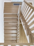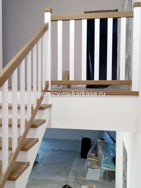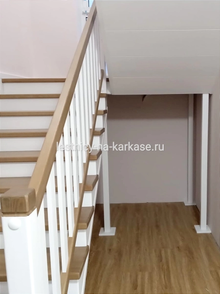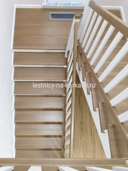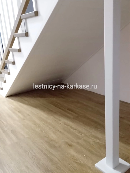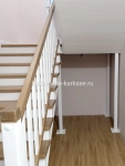 Ступени из ясеня цельноламельной 40 мм. Подступенки и плинтус выполнены также из ясеня. Выкрас ступеней в цвет по палитре, выкрас МДФ в белый цвет. Зашив низа лестницы — из МДФ.