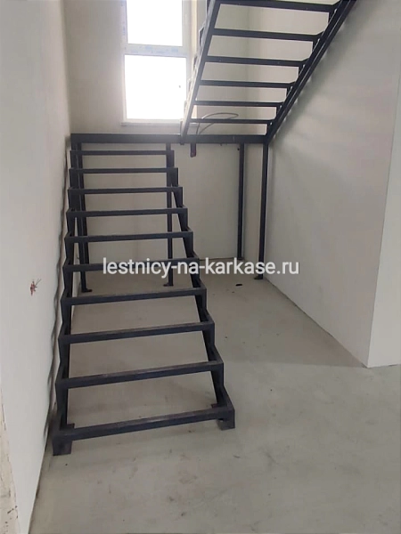 Для частного дома — лестница закрытого типа из швеллера П-образной формы с поворотной площадкой. Каркас выполнен из швеллера 10П, уголка 32 и 45. Площадка выполнена из проф.трубы 100х50, 50х50. Опорные стойки выполнены из проф.трубы 50х50. Высота каркаса 3260, высота ступени 162 мм, глубина — 250 мм. Покрыт грунтовкой черного цвета.