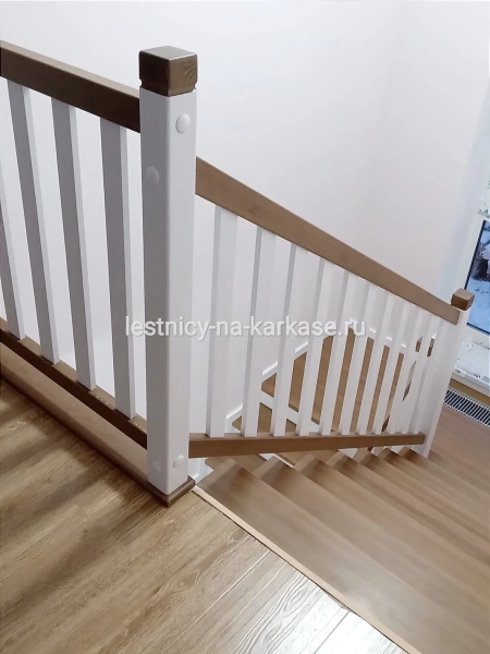 Ограждения деревянные с деревянным поручнем. Поручень окрашен в цвет ступеней.