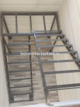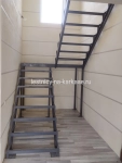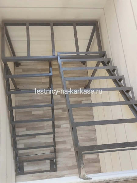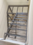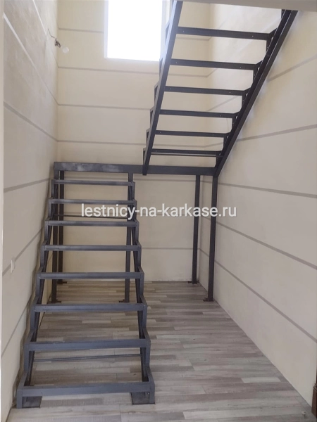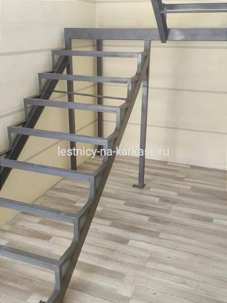 Для частного дома — каркас лестничный закрытого типа из швеллера, П-образной формы, с площадкой на опорных стойках. Каркас выполнен из швеллера 10П и уголка 45 и 32. Площадка выполнена из проф.трубы 100х50, уголка 60. Опорные стойки выполнены из проф.трубы 50х50. Высота каркаса 3270, высота ступени 200 мм, глубина — 250 мм. Покрыт грунтовкой темно-серого цвета.