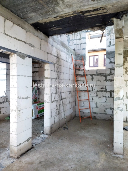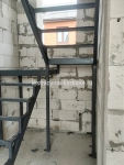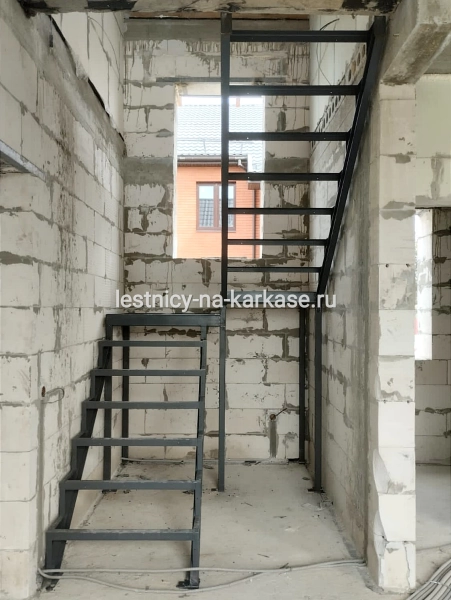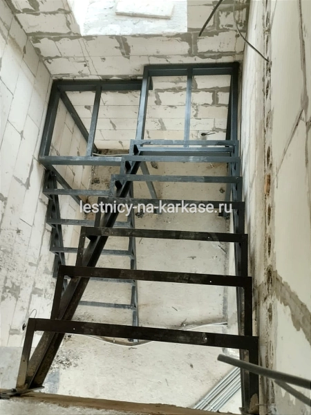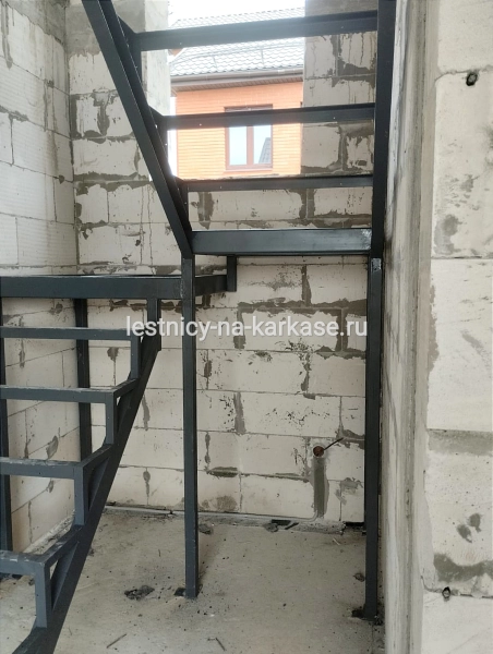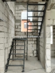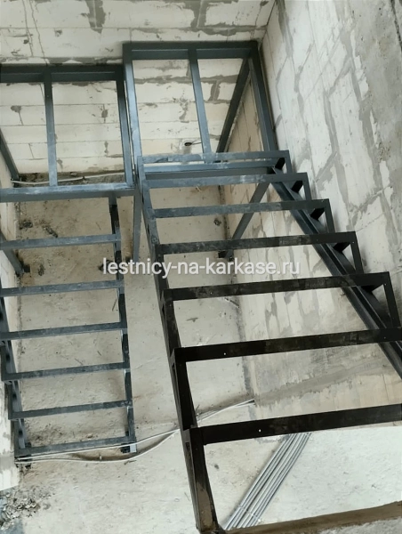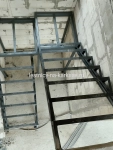 Для частного дома — каркас лестничный закрытого типа П-образной формы из швеллера с площадками на опорных стойках. Каркас выполнен из швеллера 10П и уголка 45 и 32. Площадки из проф.трубы 100х50, уголка 60. Опорные стойки выполнены из проф.трубы 50х50. Высота каркаса 3200, высота ступени 200 мм, глубина — 250 мм. Покрыт грунтовкой темно-серого цвета.