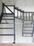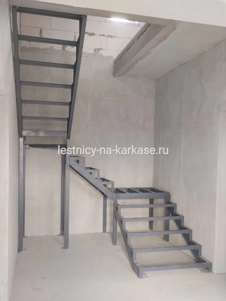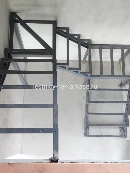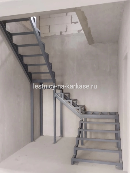 Для частного дома — каркас лестничный закрытого типа из швеллера П-образной формы с площадками на опорных стойках. Каркас выполнен из швеллера 10П и уголка 45. Опорные стойки из проф. трубы 60х60. Верхняя поворотная площадка (2 ступени) выполнена из швеллера 10 П и уголка 63 и 45. Нижняя поворотная площадка выполнена из проф. трубы 50х50, 100х50. Высота каркаса 3350, высота ступени 205 мм, глубина — 250 мм. Покрыт грунтовкой серого цвета.