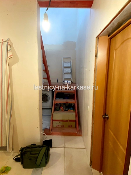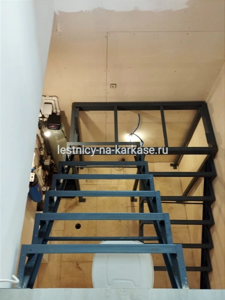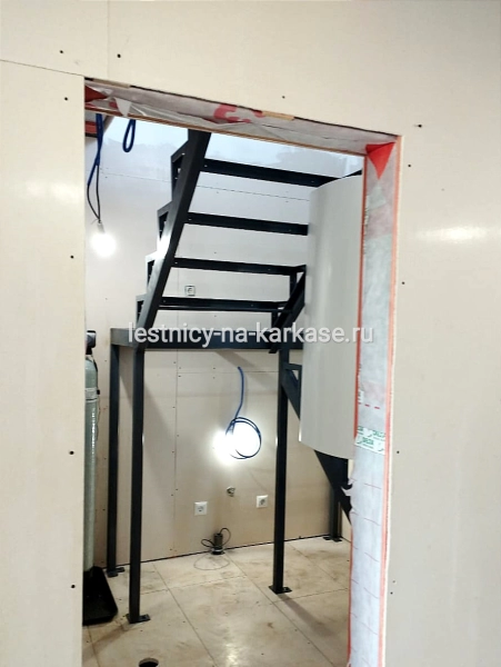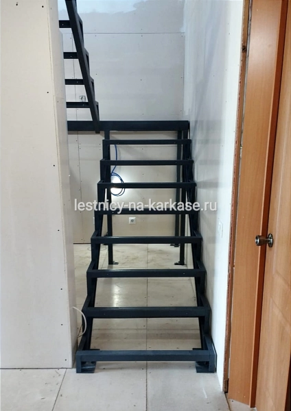 Для частного дома — каркас лестничный закрытого типа, из швеллера, П-образной формы с площадкой на опорных стойках. Каркас выполнен из швеллера 10П и уголка 45. Опорные стойки выполнены из проф.трубы 100х50. Высота каркаса 3010, высота ступени 178 мм, глубина — 250 мм. Покрыт грунтовкой темно-серого цвета.
