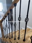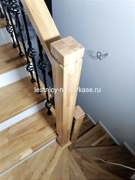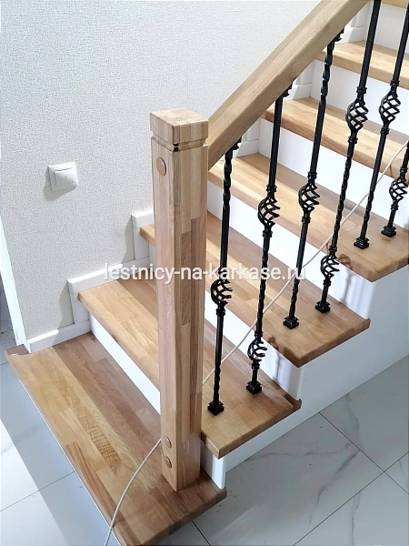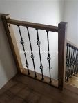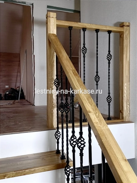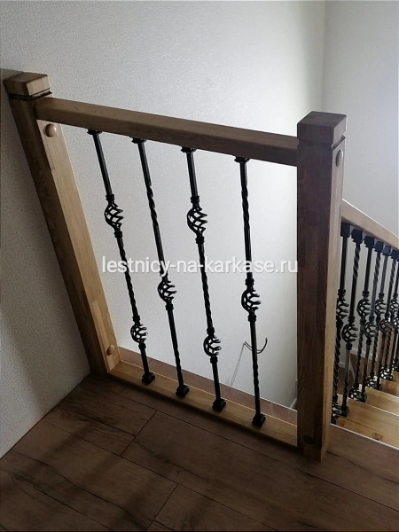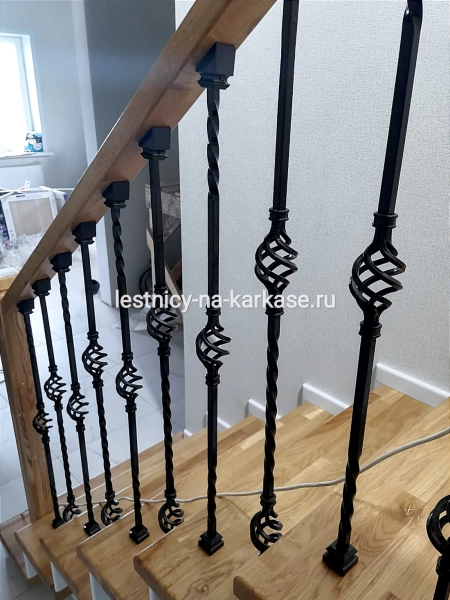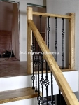 Ограждения кованные с деревянным стойками и поручнем. Окрашены в цвет ступеней.