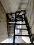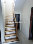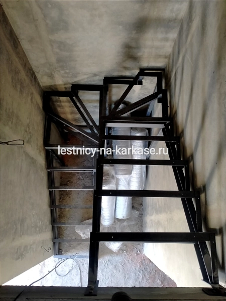 Для частного дома — лестница закрытого типа из швеллера П-образной формы с забежными ступенями. Каркас выполнен из швеллера 10П и уголка 45. Опорные стойки выполнены из проф.трубы 50х50. Высота каркаса 3481, высота ступени 189 мм, глубина — 260 мм. Покрыт грунтовкой темно-серого цвета.