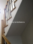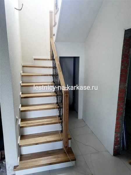 Ступени из дуба кантри паркетного 40 мм. Подступенки, фальш косоуры, сапожок по плинтусу выполнены из МДФ. Выкрас ступеней в цвет по палитре, выкрас МДФ в белый цвет. Зашив низа лестницы — из МДФ.