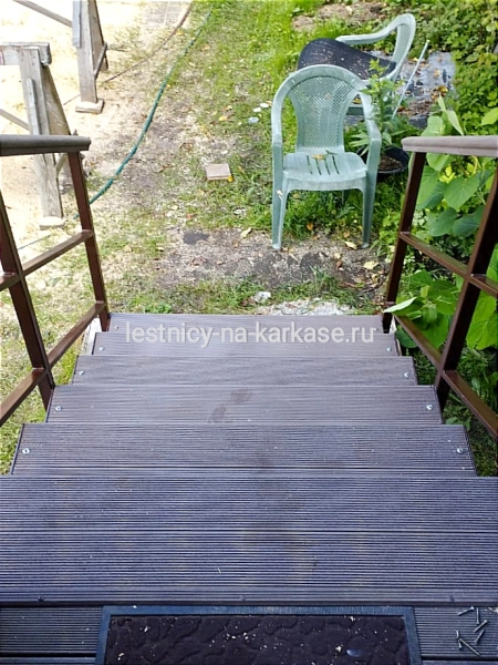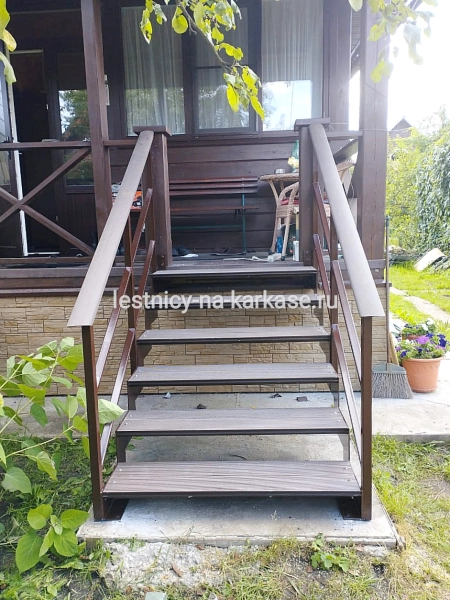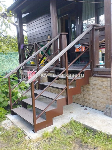Для частного дома — уличная лестница на крыльцо на ломаных косоурах из листа металла со ступенями из ДПК и ограждениями. Каркас выполнен из листа металла 6 мм, проф.трубы 40х20. Высота каркаса 1180, высота ступени 169 мм, глубина — 280 мм. Покрыт краской Hammerite коричневого цвета.
