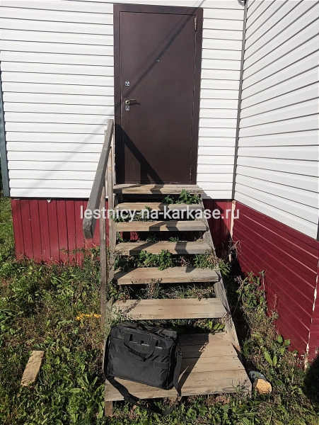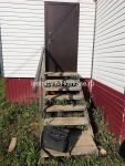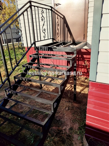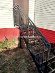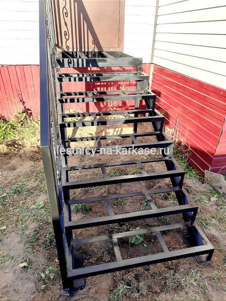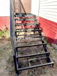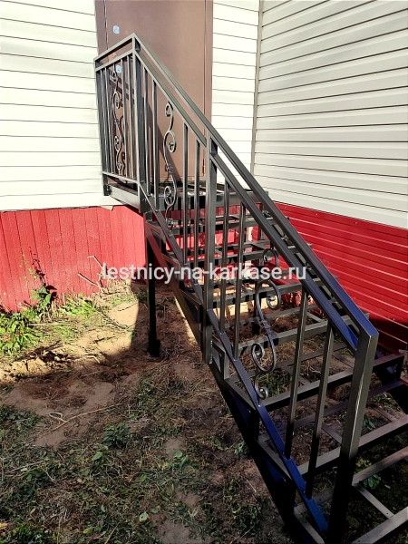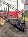 Для частного дома — уличная лестница на крыльцо с площадкой, ограждениями и опорными стойками. Каркас выполнен из швеллера 10П и уголка 45 и 32. Площадка из проф.трубы 100х50, уголка 63. Опорные стойки из проф.трубы 50х50. Высота каркаса 1124, высота ступени 160 мм, глубина — 280 мм. Покрыт краской Hammerite черного цвета.