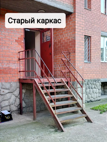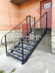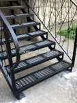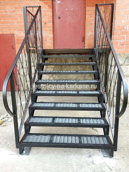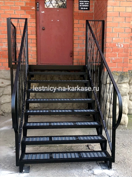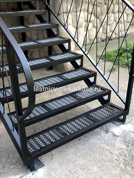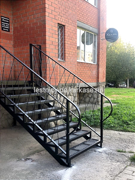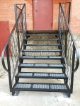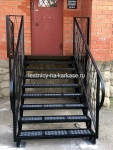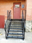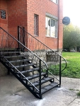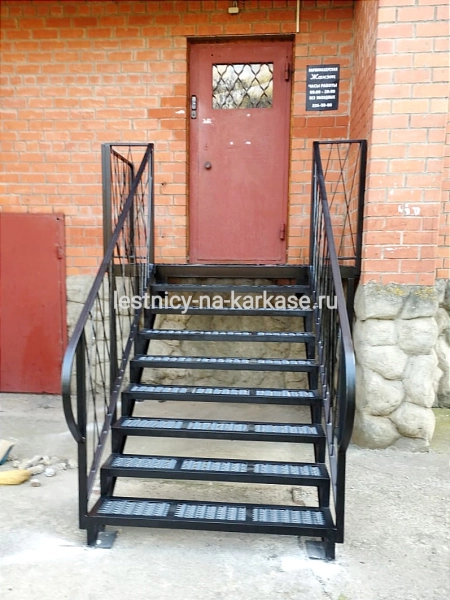 Для частного дома — уличная лестница каркасная на крыльцо с площадкой и ограждениями на опорных стойках. Каркас выполнен из швеллера 10П, уголка 45 и 32. Площадка из проф.трубы 100х50, 50х50 мм. Опорные стойки из проф.трубы 50х50 мм. Высота каркаса 1400 мм. Высота ступеней 159 мм, глубина 260 мм. Покрыт краской Hammerite черного цвета.