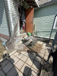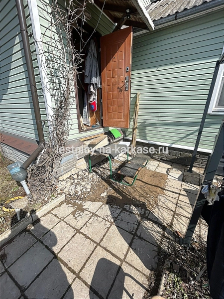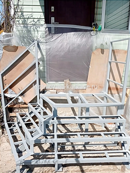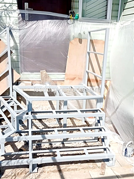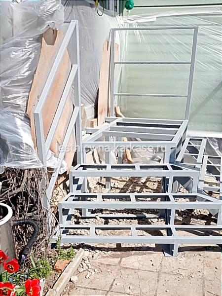 Для частного дома — уличная лестница каркасная на крыльцо с площадкой и ограждениями. Каркас выполнен из швеллера 10П и уголка 45 и 32. Площадка из проф.трубы 50х50, 50х30, уголка 45. Высота каркаса 980, высота ступени 196 мм, глубина — 250 мм. Покрыт краской Hammerite серого цвета.