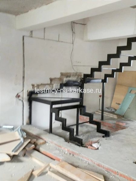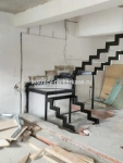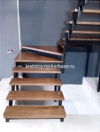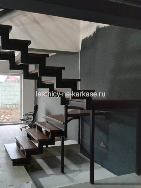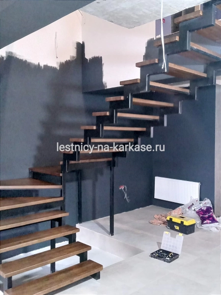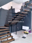 Для частного дома — лестница открытого типа на ломаных косоурах П-образной формы с забежными ступенями. Каркас выполнен из проф.трубы 100х50, 40х20 мм. Забежные ступени выполнены из проф.трубы 100х50 и профиля 63. Высота каркаса 3070, высота ступени 162 мм, глубина — 250 мм. Покрыт черной глянцевой краской Hammerite.