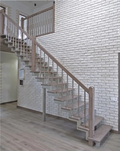 Лестница на металлическом каркасе на второй этаж с отделкой и ограждениями из дерева №65