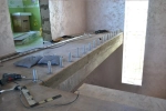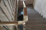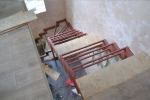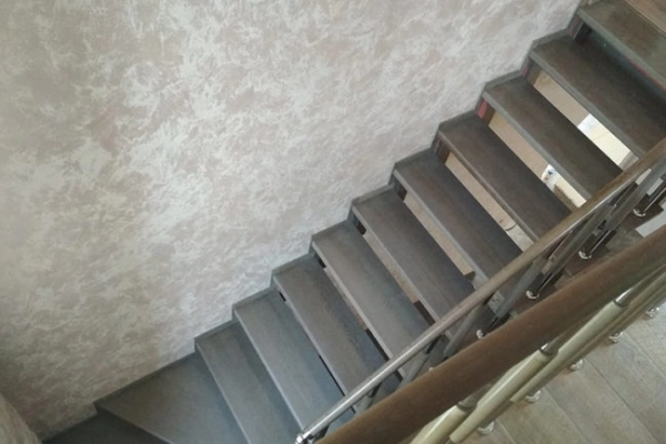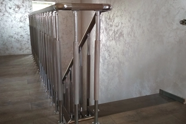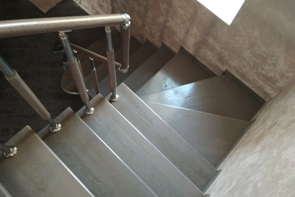 Лестница на металлическом каркасе из профильной трубы с обшивкой деревом. Ступени выполнены из дуба толщиной 40 мм. Ширина лестницы 1000 мм, шаг ступени 300 мм. Для ограждения используется хромированная труба D32мм с толщиной стенки 0,8 мм.