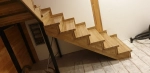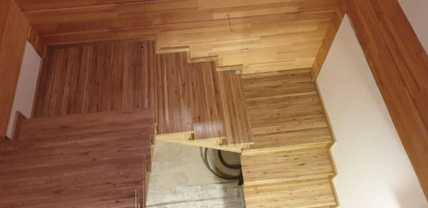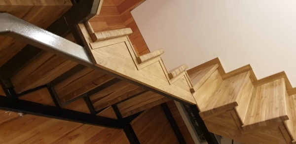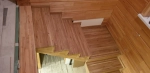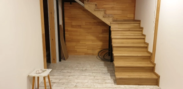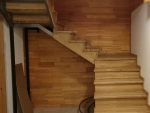 Лестница закрытого типа установлена в частный дом. П-образная с площадками. Каркас выполнен из профильной трубы и уголка. В лестнице 13 ступеней. Каркас обшит деревом: ступени – лиственница, остальная обшивка – сосна.