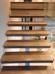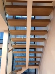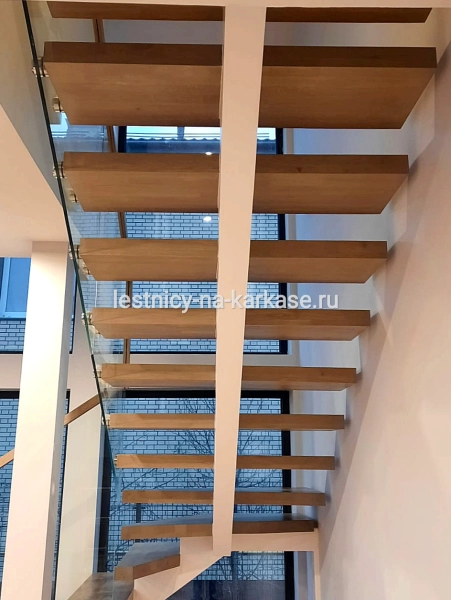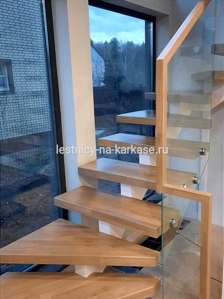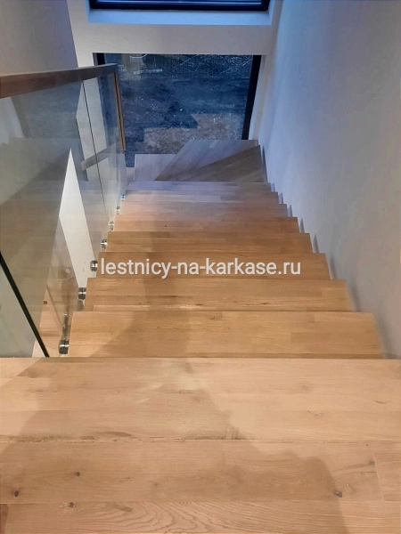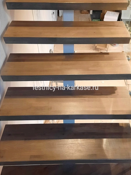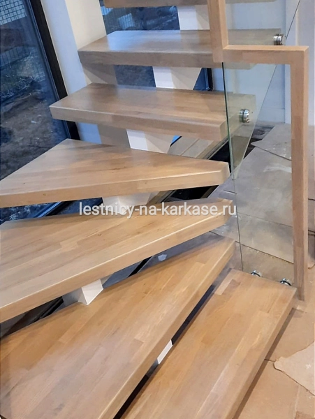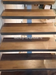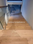 Ступени из дуба кантри паркетного 80 мм, покрыты лаком в два слоя.
