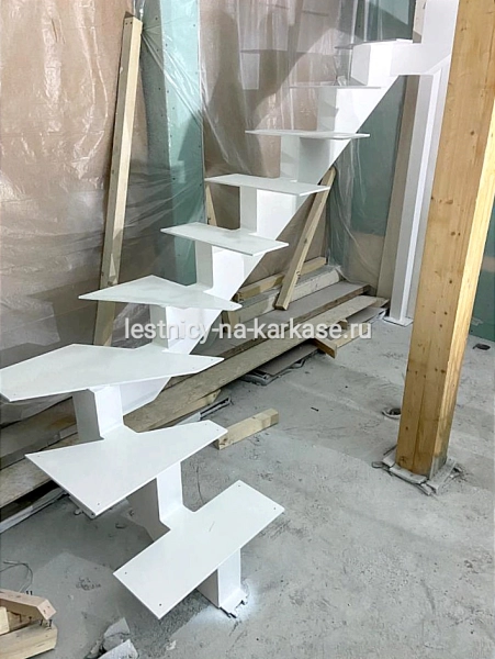 Для частного дома — лестница открытого типа на монокосоуре П-образной формы с забежными ступенями. Каркас выполнен из проф.трубы из листа ГК 6 и 8 мм. Опорные стойки выполнены из проф.трубы 80х80. Высота каркаса 3230 мм, высота ступени 170 мм, глубина — 250 мм. Покрыт белой глянцевой краской Hammerite.
