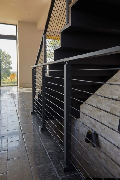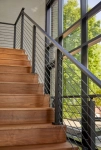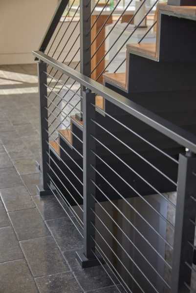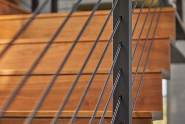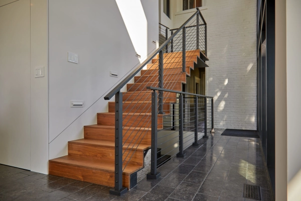 Межэтажная лестница закрытого типа с металлическими перилами и ступеньками обшитыми деревом.