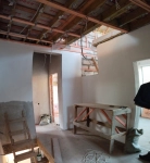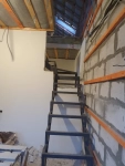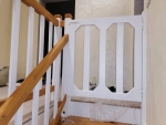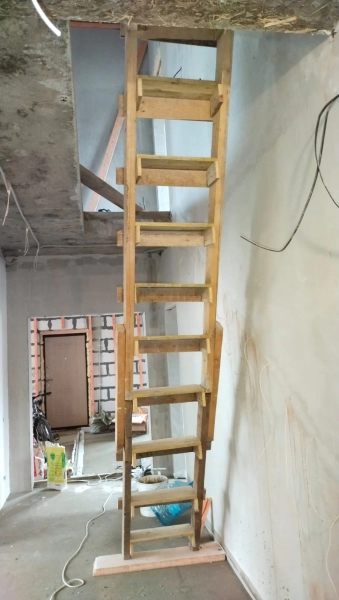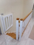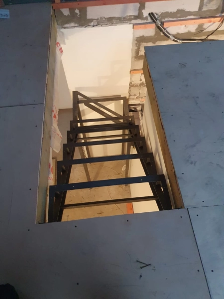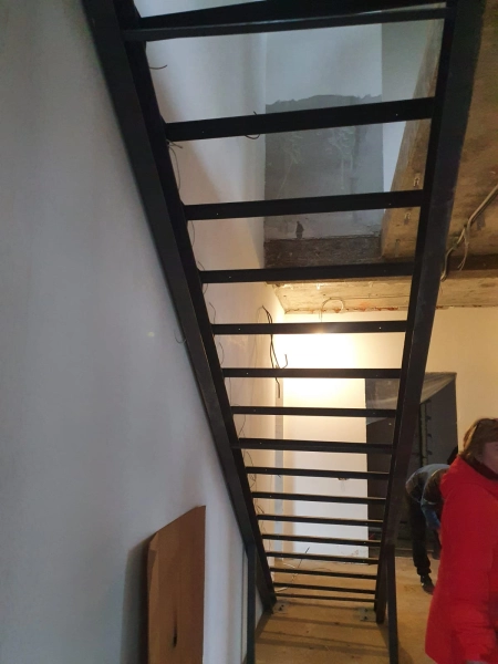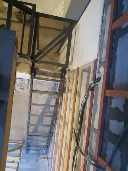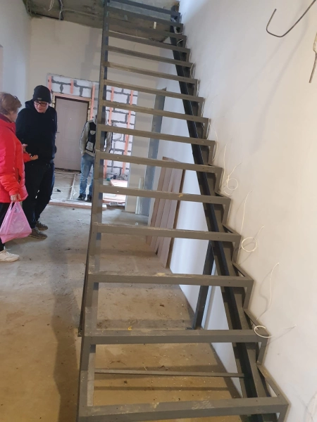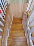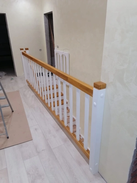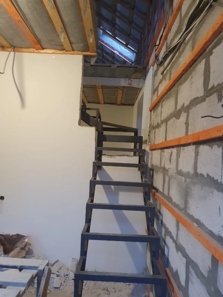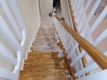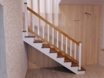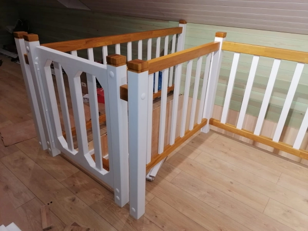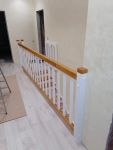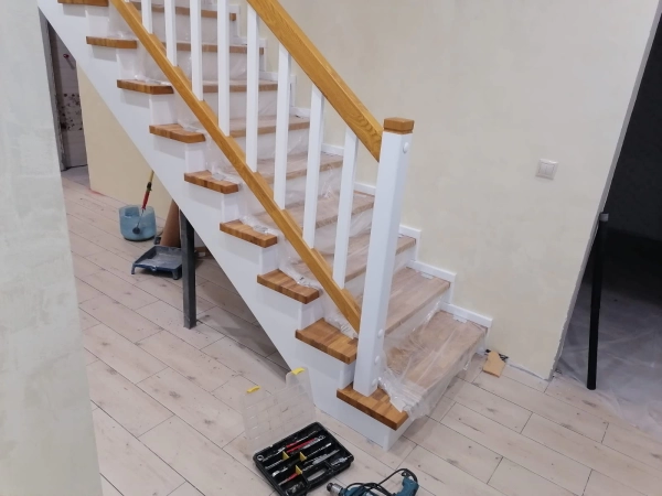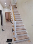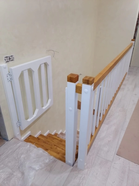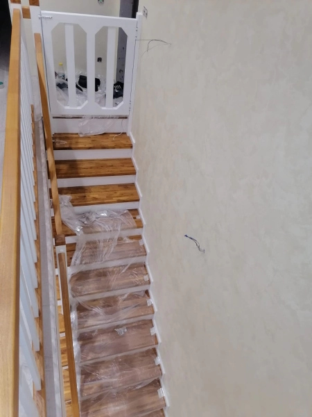 Две лестницы закрытого типа: с забежными ступенями и прямая лестница. Каркас первой лестницы выполнены из швеллера 10П и уголка 45. Каркас второй лестницы выполнен из швеллера 16П и уголка 45. Каркасы покрыты грунтовкой серого цвета. Обшивка: ступени из дуба кантри 40 мм, покрытые лаком в два слоя, подступенники, плинтус, фальшкосоуры, зашивка лестницы снизу МДФ. Ограждения установлены из дерева и окрашены в цвет обшивки. Дополнительно под запрос клиента на лестницы установлены дверцы с защитой для детей.