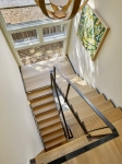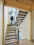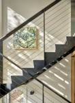 Лестница открытого типа в частный дом. П-образная с площадкой вдоль окна. Каркас из листа металла 8 мм. 16 ступеней и площадка. Покраска Hammeriteчерная матовая. Ступени и площадка выполнены из лиственницы цельноламельной в стилистике дома. Ограждения выполнены из профильной трубы с натянутыми тросиками вдоль лестницы, по свету второго этажа и на нижний установленный марш.