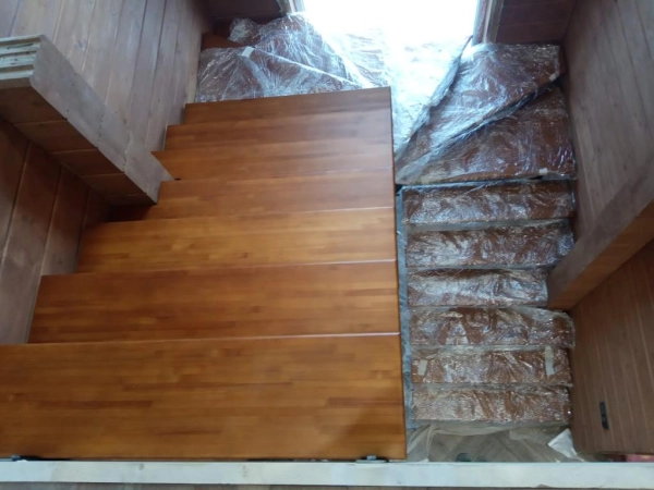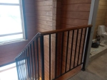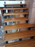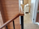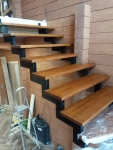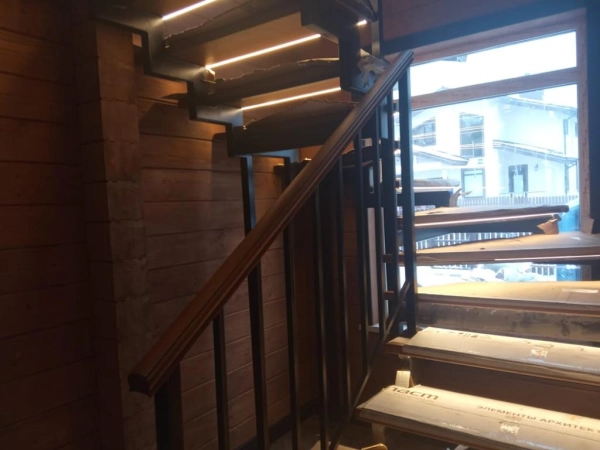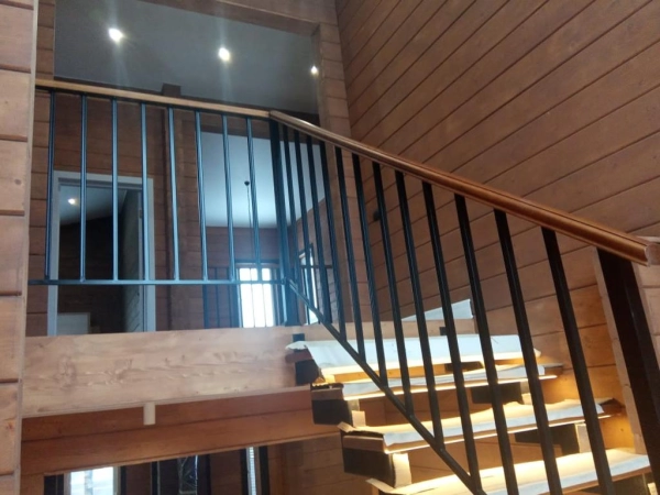 Лестница открытого типа частный дом П-образная. Каркас из профильной трубы 100х50. Ступени из паркетной лиственницы 40 мм. Покраска Hammerite черная глянцевая. Ограждения из профильной трубы 40х40 и 20х20 с деревянным поручнем.