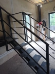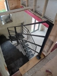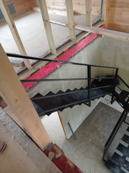 Лестница открытого типа на монокосоуре в частный дом П-образная. Каркас из усиленной профильной трубы 140х100. Площадка под ступени выполнена из листа металла 8 мм. Покраска Hammerite черная матовая. Ограждения закреплены напрямую к каркасу, выполнены из профильной трубы 40х40.