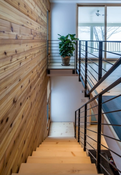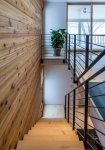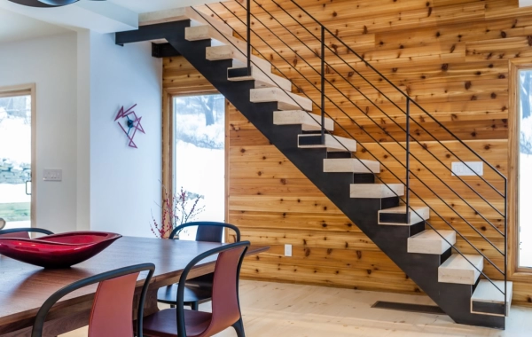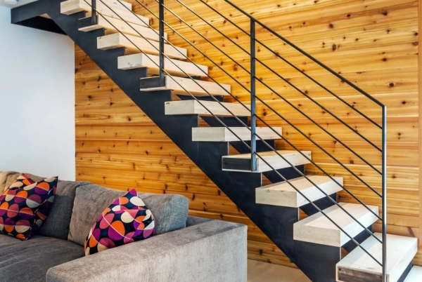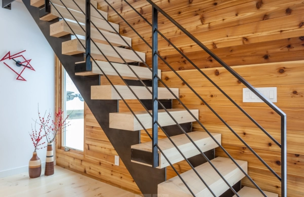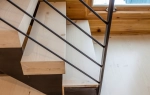 Лестница открытого типа в стиле ЛОФТ в частный дом вдоль стены. Ступени выполнены из паркетной сосны 80 мм. Ограждения выполнены из профильной трубы 40х20 и гладкой арматуры 8 мм. Покраска Hammerite черная матовая.