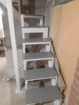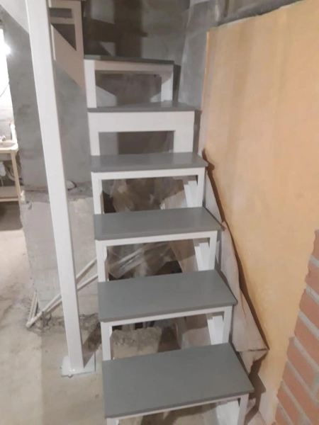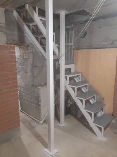 Лестница открытого типа в стиле ЛОФТ в подвал частного дома Г-образная. Каркас из швеллера 10 и уголка 45. Ступени из фанеры 12 мм. Покраска Hammerite светло-серая матовая.