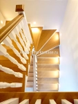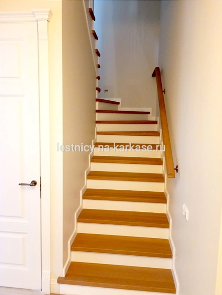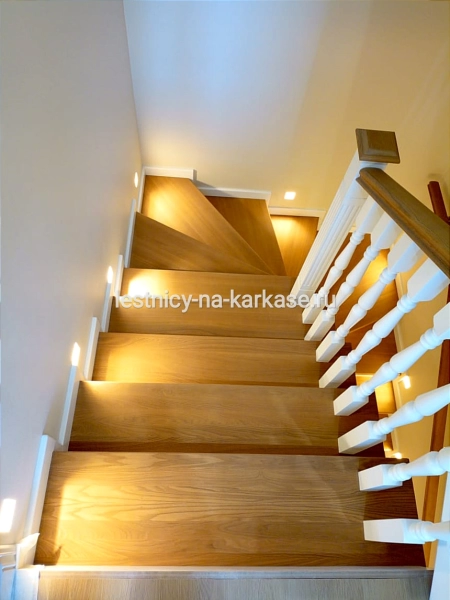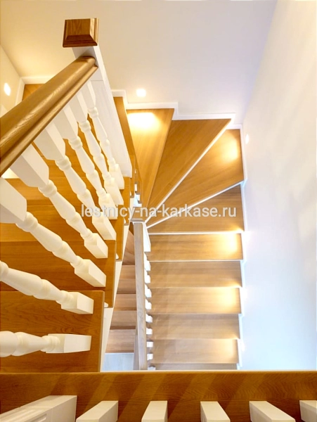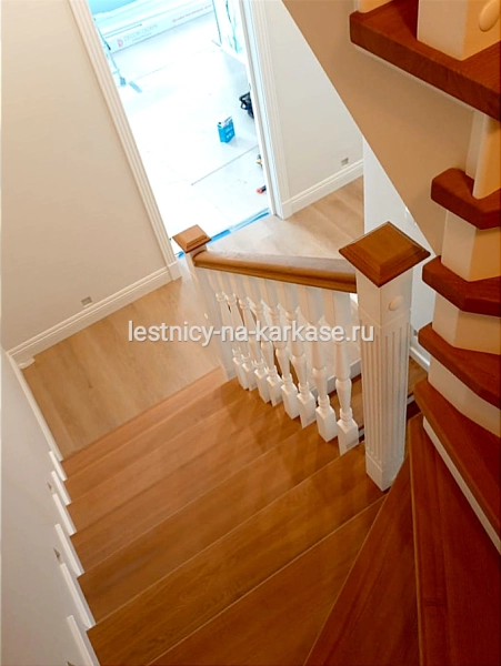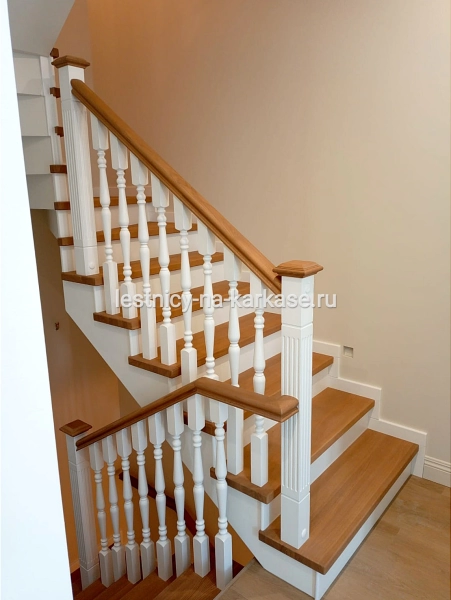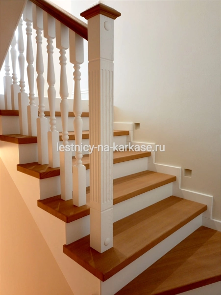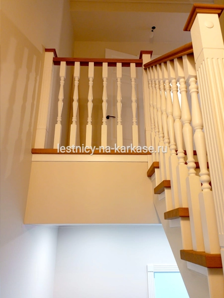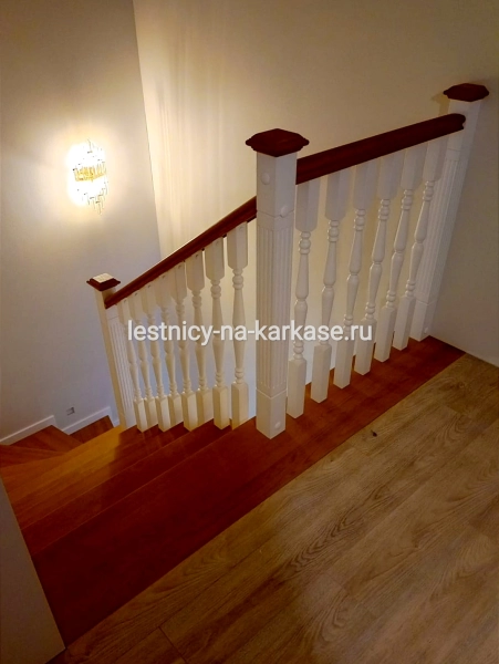 Ступени из ясеня цельноламельного 40 мм, покрыты лаком в два слоя. Выкрас ступеней в цвет по палитре. Ограждения из лиственницы резные, покрыты лаком в два слоя.