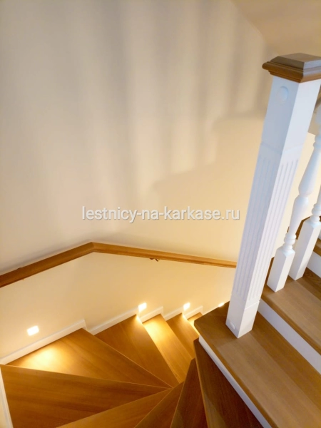 Для частного дома — лестница закрытого типа из швеллера Г-образной формы с забежными ступенями. Верхний марш и пригласительные ступени выполнены из швеллера 10П, уголка 45. Забежные ступени из проф.трубы 100х50, профиля 63. Высота каркаса 3020, высота ступени 170 мм, глубина — 270 мм. Покрыт грунтовкой черного цвета.