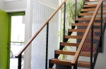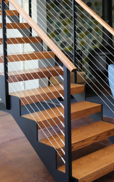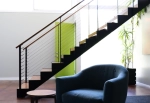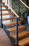 Прямая лестница открытого типа в частный дом. Каркас из листа металла 8 мм. Ступени выполнены из цельноламельной лиственницы 40 мм. Ограждения установлены двух сторон лестницы из профильной трубы 40х20 с натянутыми тросиками и с деревянным поручнем. Покраска Hammerite черная матовая.