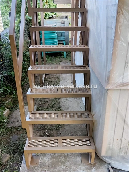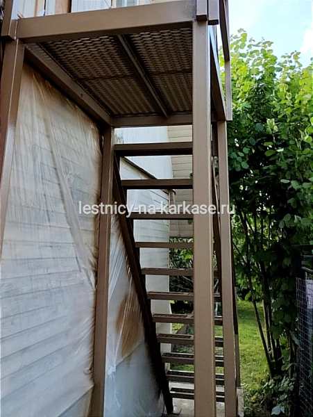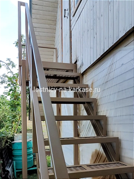 Для частного дома — уличная лестница прямой формы с площадкой на опорных стойках. Марш лестницы выполнен из швеллера 10П, уголка 45 и 32. Площадка из проф.трубы 100х50, профиля 60. Опорные стойки выполнены из проф.трубы 60х60. Высота каркаса 2700, высота ступени 220 мм, глубина — 250 мм. Покрыт каркас коричневой краской Hammerite.
