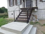 Входные лестницы на тетиве из швеллера. Ступени преимущественно ДПК, лист металла, чечевичный лист или лист ПВЛ. Ограждения металлические из профильной трубы.