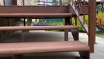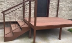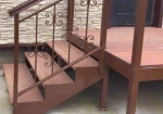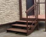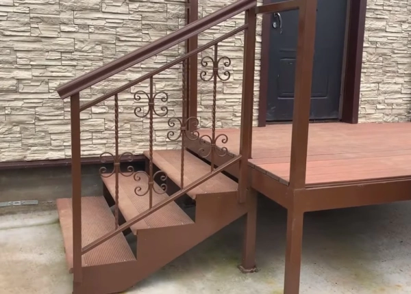 Входная уличная лестница на металлическом каркасе с площадкой из металлопрофильной трубы с кованными элементами.
