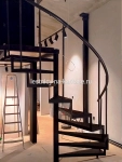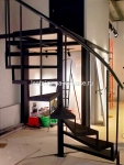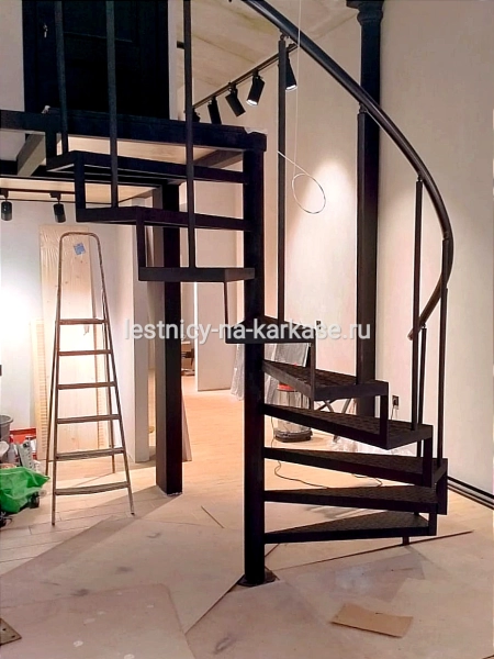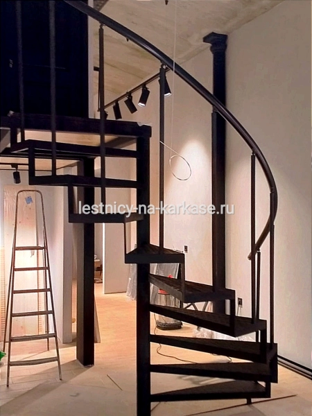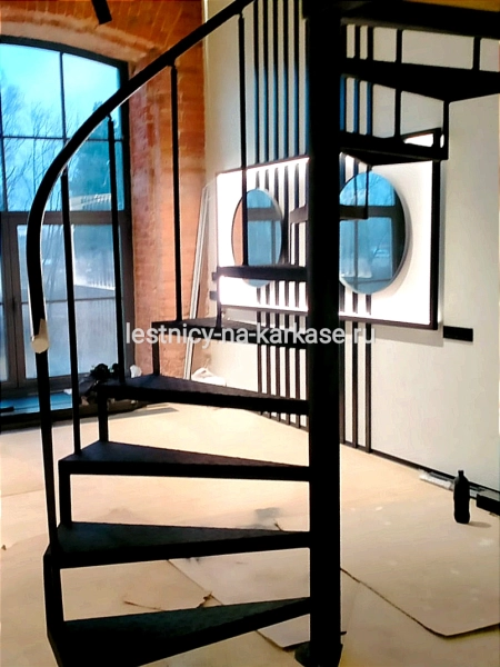 Для частного дома — винтовая лестница на опорном столбе. Каркас выполнен из профильной трубы 80х80. Высота каркаса 2323, высота ступени 232 мм, глубина — 250 мм. Покрыт черной глянцевой краской Hammerite.